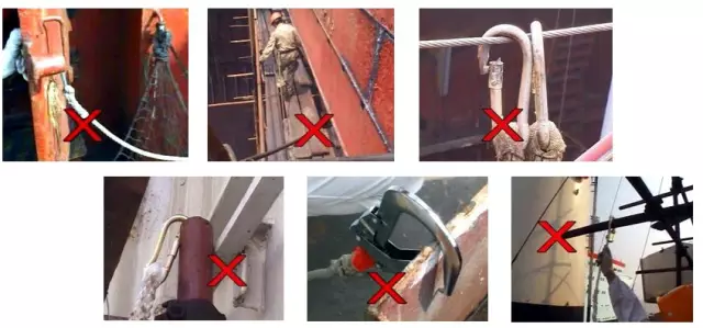 不能把掛鉤扣在可以活動(dòng)的物件上;不能把安全繩拖在地上走;不能把安全帶系在物件的開(kāi)口處(自由端);不能把掛鉤扣搭在物件的邊緣等。