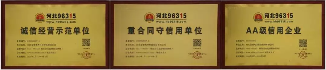金能電力榮獲河北96315“誠信經(jīng)營示范單位”、“重合同守信用單位”、“AA級信用企業(yè)